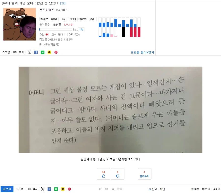 "즐겨 가던 순대국밥집 문 닫았네" Anonymous | 2026.03.23 22:57 | 조회 4 https://qquing.net/bbs/board.php?bo_table=humor&wr_id=1864931 주소 복사 이전글 다음글 랜덤 만화 목록 본문 "아니 짤 뭐냐?" 추천 0 비추천 0