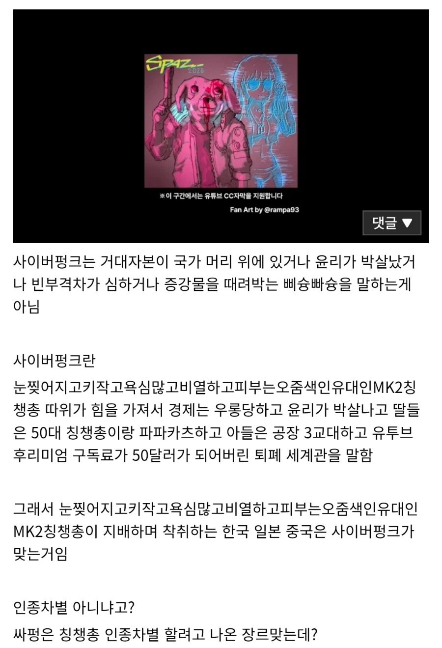"너희들 사이버펑크에 대해 잘못 알고 있어" Anonymous | 2026.03.27 12:39 | 조회 7 https://qquing.net/bbs/board.php?bo_table=humor&wr_id=1869825 주소 복사 이전글 다음글 랜덤 만화 목록 본문 ...사실 이런 장르 맞는데블레이드 러너 등의 작품이 흥하면서"동양에 대한 공포" 색채 빼고 가게 됨 추천 0 비추천 0