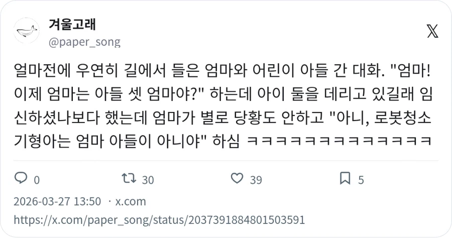 "엄마! 이제 엄마는 아들 셋 엄마야?" Anonymous | 2026.03.28 02:22 | 조회 4 https://qquing.net/bbs/board.php?bo_table=humor&wr_id=1870830 주소 복사 이전글 다음글 랜덤 만화 목록 본문 추천 0 비추천 0