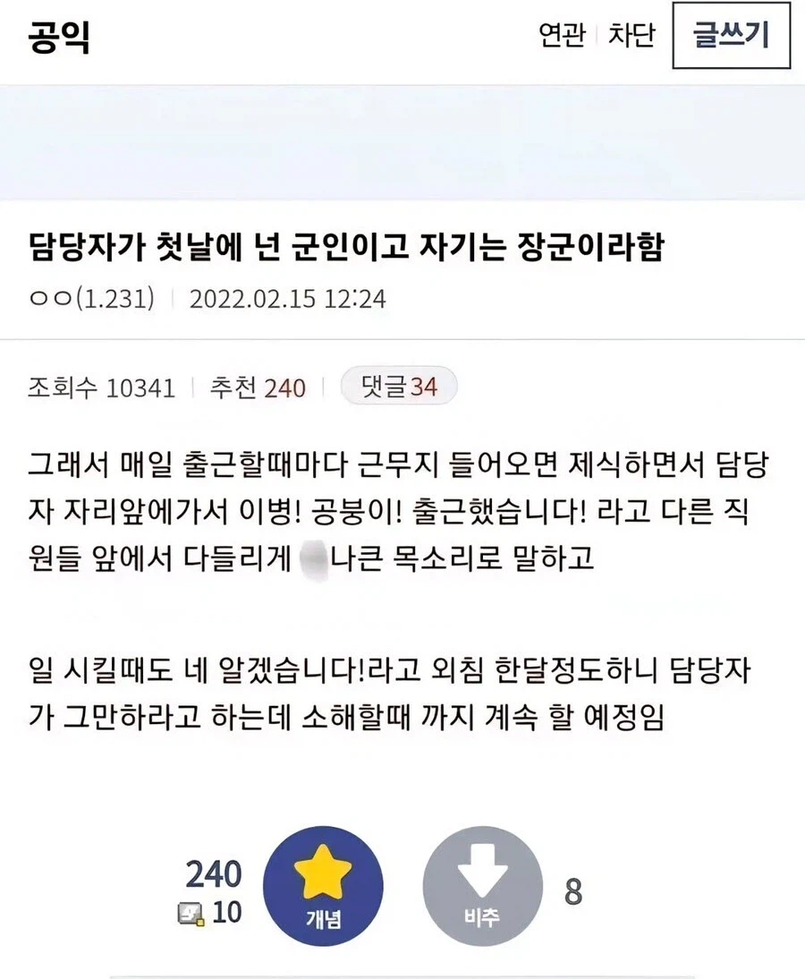 "넌 군인이고 난 장군이야" Anonymous | 2026.03.31 03:19 | 조회 11 https://qquing.net/bbs/board.php?bo_table=humor&wr_id=1874903 주소 복사 이전글 다음글 랜덤 만화 목록 본문 공익 카페 활성화 되기 전에 저런 갑질 부리는 담당자 졸라 많았지 ㅋㅋ 추천 0 비추천 0