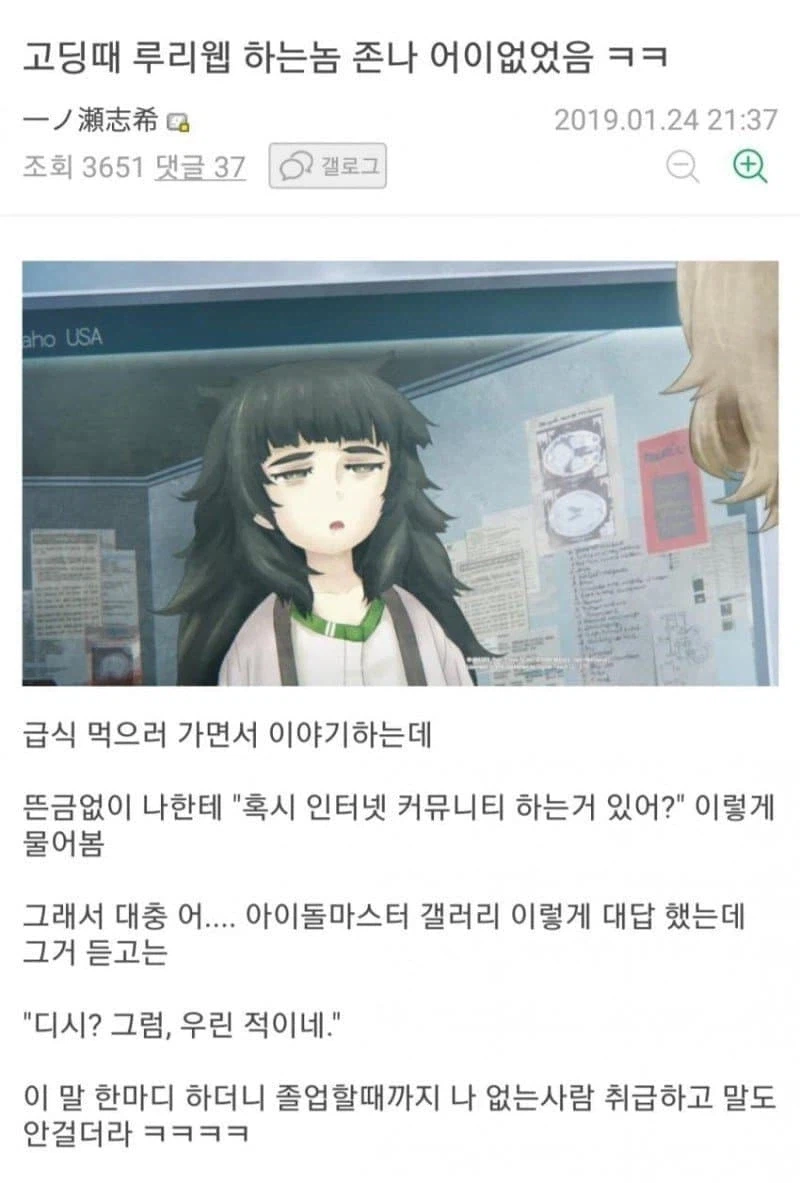 "그럼 우린 적이네" Anonymous | 2026.03.31 22:12 | 조회 11 https://qquing.net/bbs/board.php?bo_table=humor&wr_id=1875944 주소 복사 이전글 다음글 랜덤 만화 목록 본문 추천 0 비추천 0