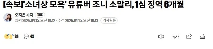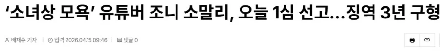 '소녀상 모욕' 유튜버 조니 소말리, 1심 결과 Anonymous | 2026.04.15 20:08 | 조회 13 https://qquing.net/bbs/board.php?bo_table=humor&wr_id=1895280 주소 복사 이전글 다음글 랜덤 만화 목록