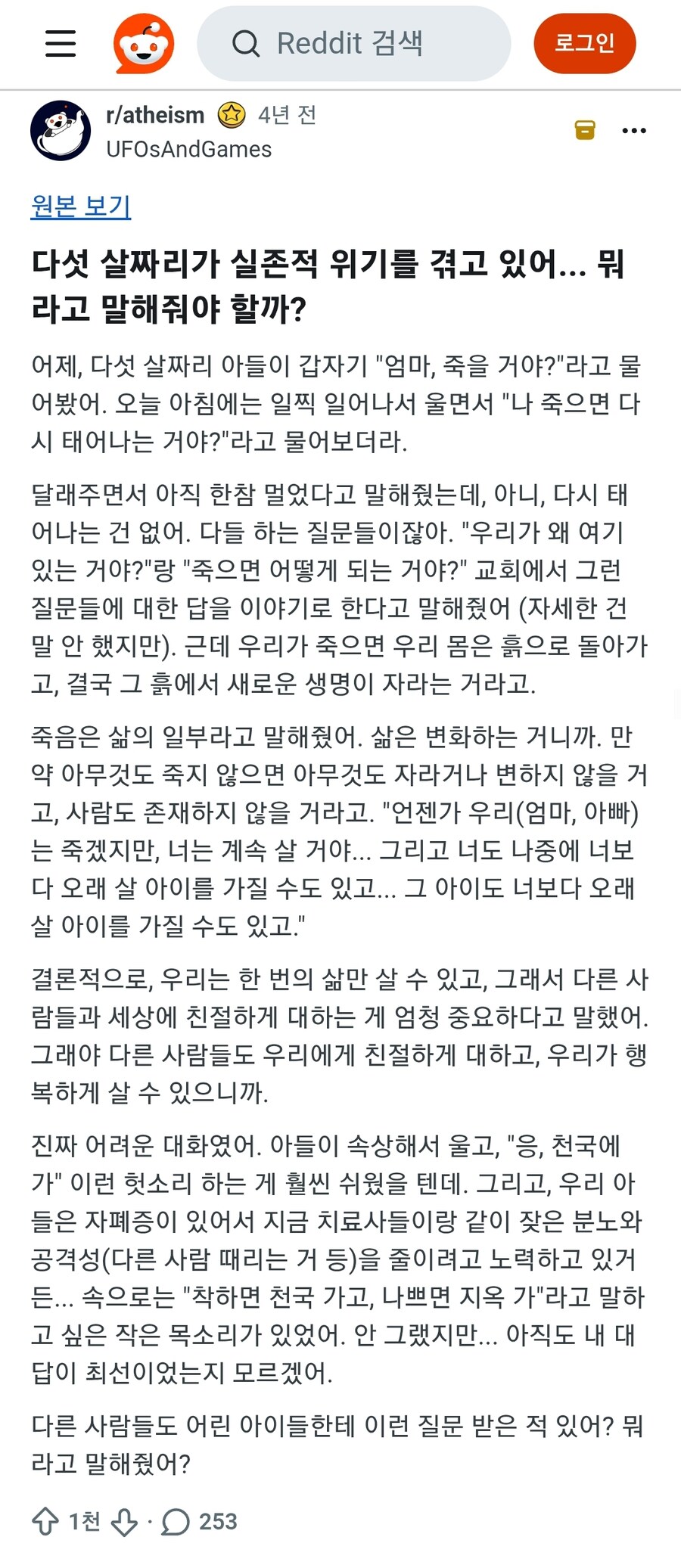 "다섯 살짜리가 실존적 위기를 겪고 있어..." Anonymous | 2025.10.26 20:32 | 조회 6 https://qquing.net/bbs/board.php?bo_table=humor&wr_id=1679694 주소 복사 이전글 다음글 랜덤 만화 목록 본문 그에 대한 답변들 어려운 문제군... 추천 0 비추천 0