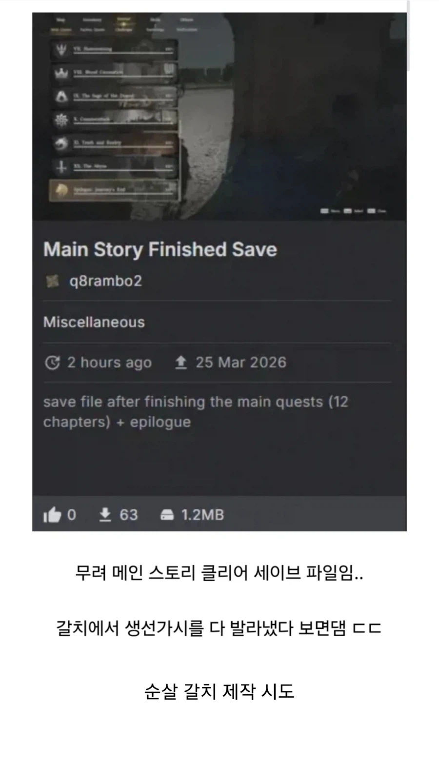 "붉은사막은 야겜이다" Anonymous | 2026.03.26 10:34 | 조회 11 https://qquing.net/bbs/board.php?bo_table=humor&wr_id=1868346 주소 복사 이전글 다음글 랜덤 만화 목록 본문 진행이 개 좇같아서 클리어하려고 플레이하기 존나 싫은데클리어 세이브파일을 써서라도 퍼먹고 싶어진다?? 이건 야겜이 맞다 추천 0 비추천 0