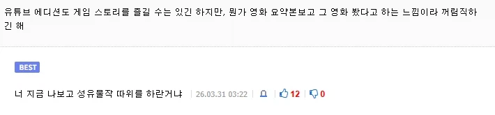 "유튜브로 게임 스토리보고 꺼드럭대는거 별로지 않음?" Anonymous | 2026.04.01 12:22 | 조회 7 https://qquing.net/bbs/board.php?bo_table=humor&wr_id=1876660 주소 복사 이전글 다음글 랜덤 만화 목록 본문 추천 0 비추천 0