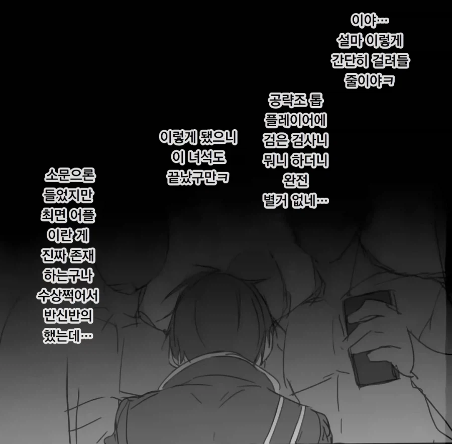 "뭐가 공략조 톱플레이어 검은 검사냐 ㅋㅋㅋㅋㅋ" Anonymous | 2026.04.06 22:57 | 조회 6 https://qquing.net/bbs/board.php?bo_table=humor&wr_id=1883677 주소 복사 이전글 다음글 랜덤 만화 목록 본문 이후 해킹툴 사용 의심 유저로 전부 밴당했다. 추천 0 비추천 0