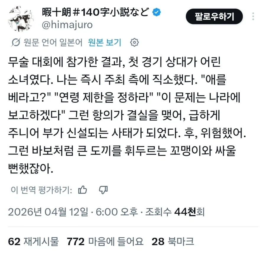 "지금 나보고 어린 소녀와 싸우라는건가!" Anonymous | 2026.04.13 00:24 | 조회 4 https://qquing.net/bbs/board.php?bo_table=humor&wr_id=1891474 주소 복사 이전글 다음글 랜덤 만화 목록