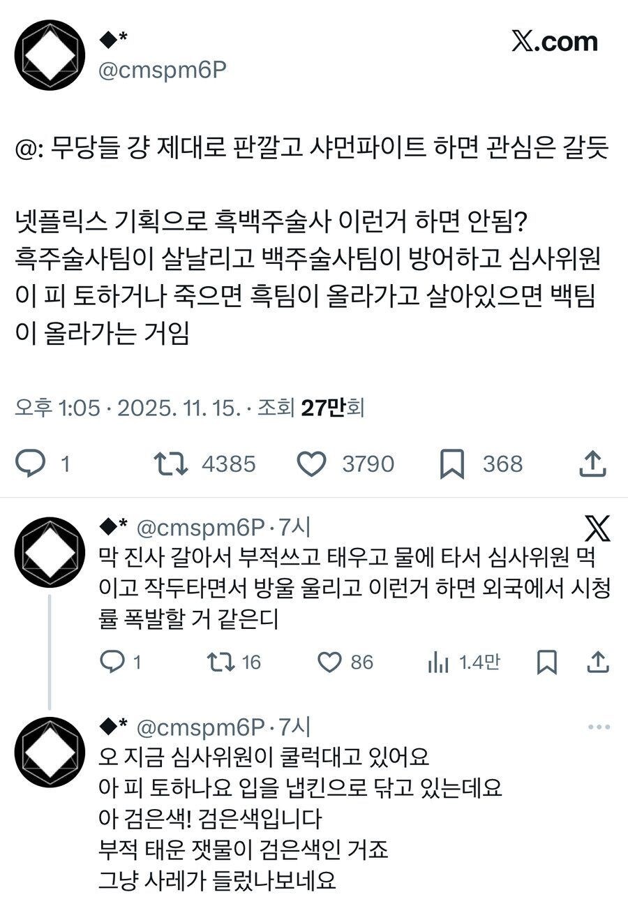 "K-무당배틀이라면, 보고 싶을지도...?" Anonymous | 2025.11.16 10:24 | 조회 11 https://qquing.net/bbs/board.php?bo_table=humor&wr_id=1705127 주소 복사 이전글 다음글 랜덤 만화 목록 본문 추천 0 비추천 0