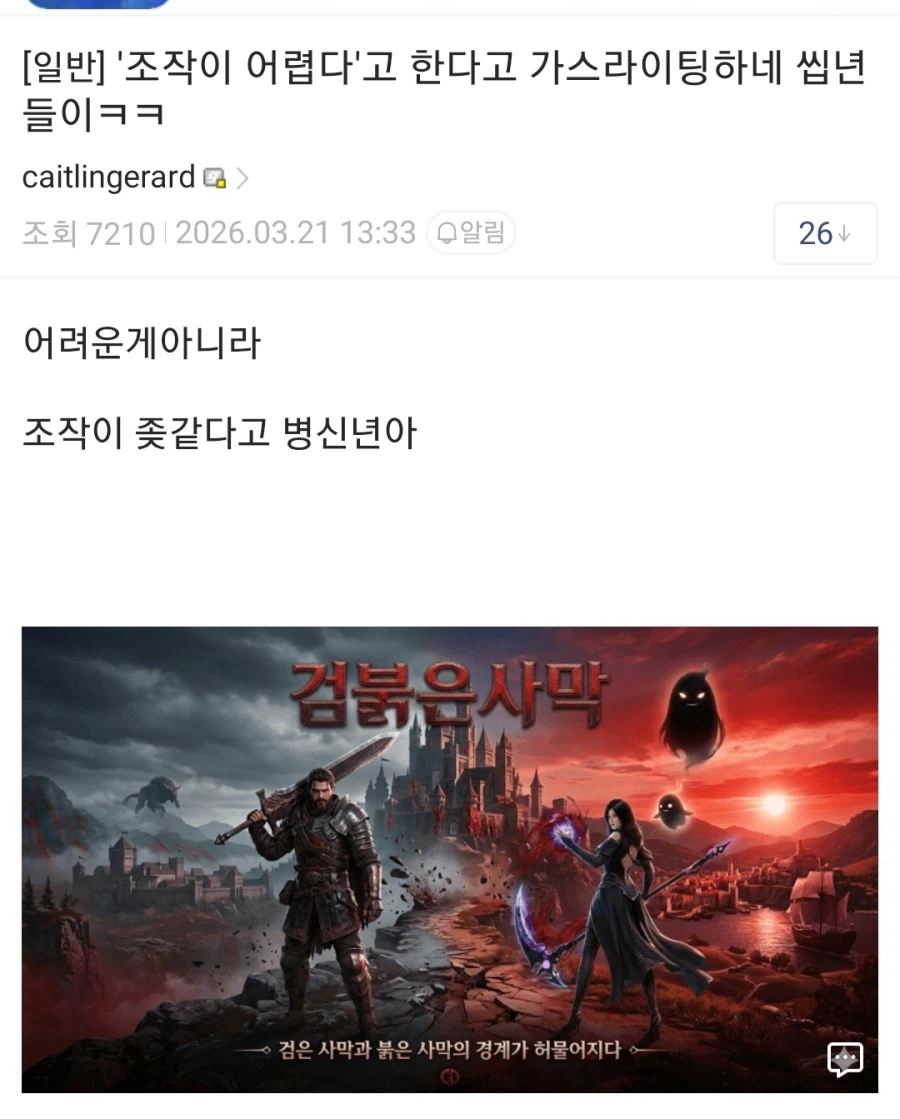 "붉은사막 조작이 어렵다는건 사실상 가스라이팅 아님? ㅋㅋㅋ".jpg Anonymous | 2026.03.21 20:26 | 조회 5 https://qquing.net/bbs/board.php?bo_table=humor&wr_id=1861998 주소 복사 이전글 다음글 랜덤 만화 목록 본문 추천 0 비추천 0