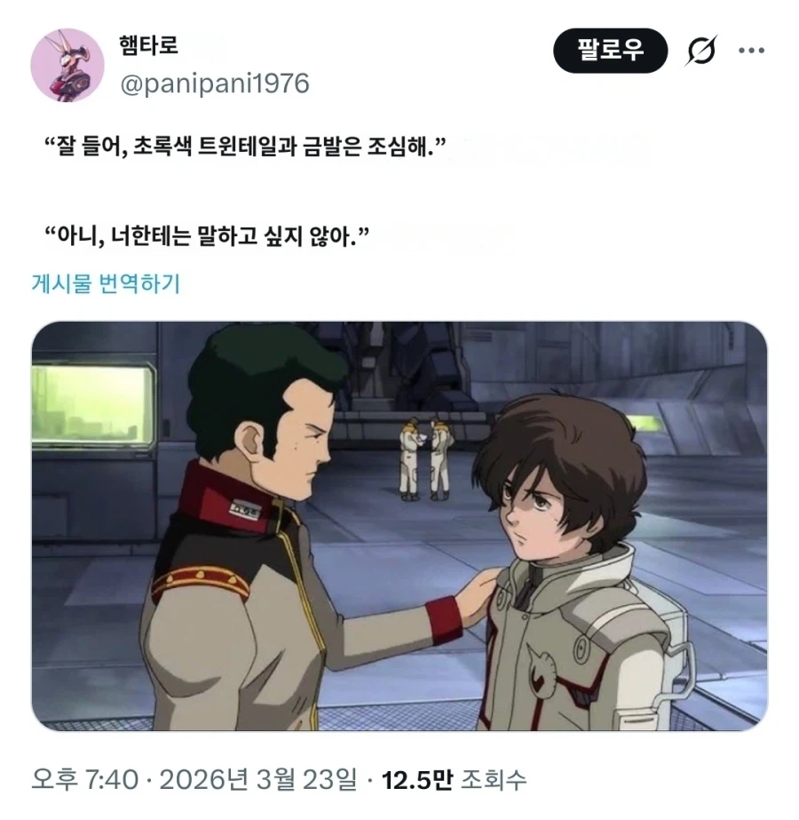 "녹색 트윈테일 여자를 조심해라" Anonymous | 2026.03.24 13:58 | 조회 7 https://qquing.net/bbs/board.php?bo_table=humor&wr_id=1865675 주소 복사 이전글 다음글 랜덤 만화 목록 본문 "그건 당신 아들이 테러리스트가 된 이유잖아요" 어린 놈이 건방지게 추천 0 비추천 0