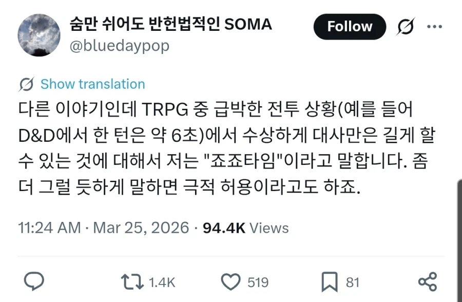 "TRPG에서 꼭 필요한 룰 개무시" Anonymous | 2026.03.26 12:34 | 조회 11 https://qquing.net/bbs/board.php?bo_table=humor&wr_id=1868450 주소 복사 이전글 다음글 랜덤 만화 목록 본문 "말할 시간" 추천 0 비추천 0