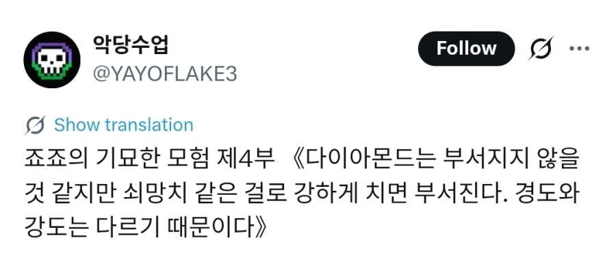 "죠죠의 기묘한 모험 제 4부" Anonymous | 2026.03.31 18:26 | 조회 6 https://qquing.net/bbs/board.php?bo_table=humor&wr_id=1875651 주소 복사 이전글 다음글 랜덤 만화 목록 본문 추천 0 비추천 0