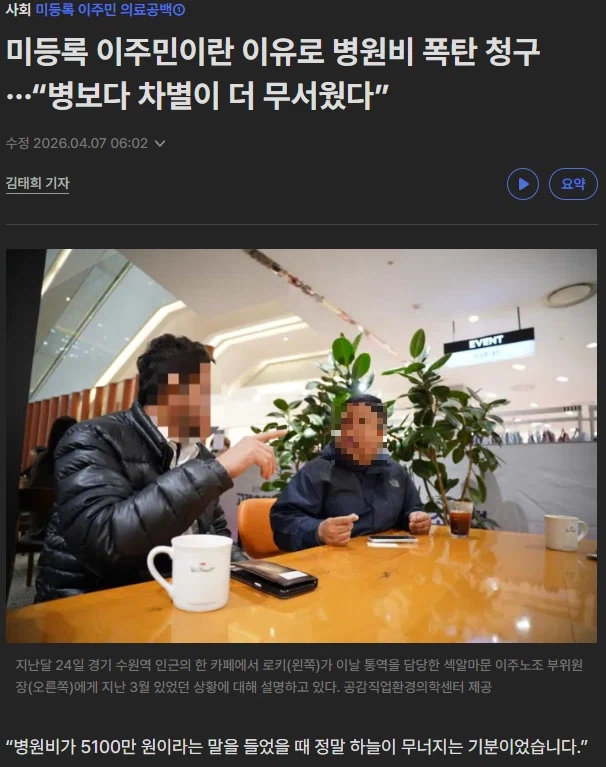 'ㅇㅇㅇ ㅇㅇㅇ' 이라는 이유로 병원비 폭탄 청구! Anonymous | 2026.04.07 14:06 | 조회 5 https://qquing.net/bbs/board.php?bo_table=humor&wr_id=1884453 주소 복사 이전글 다음글 랜덤 만화 목록 본문 순간 미등록 이주민이 뭐지? 싶었네. 미등록 이주민 = 불법체류자 추천 0 비추천 0