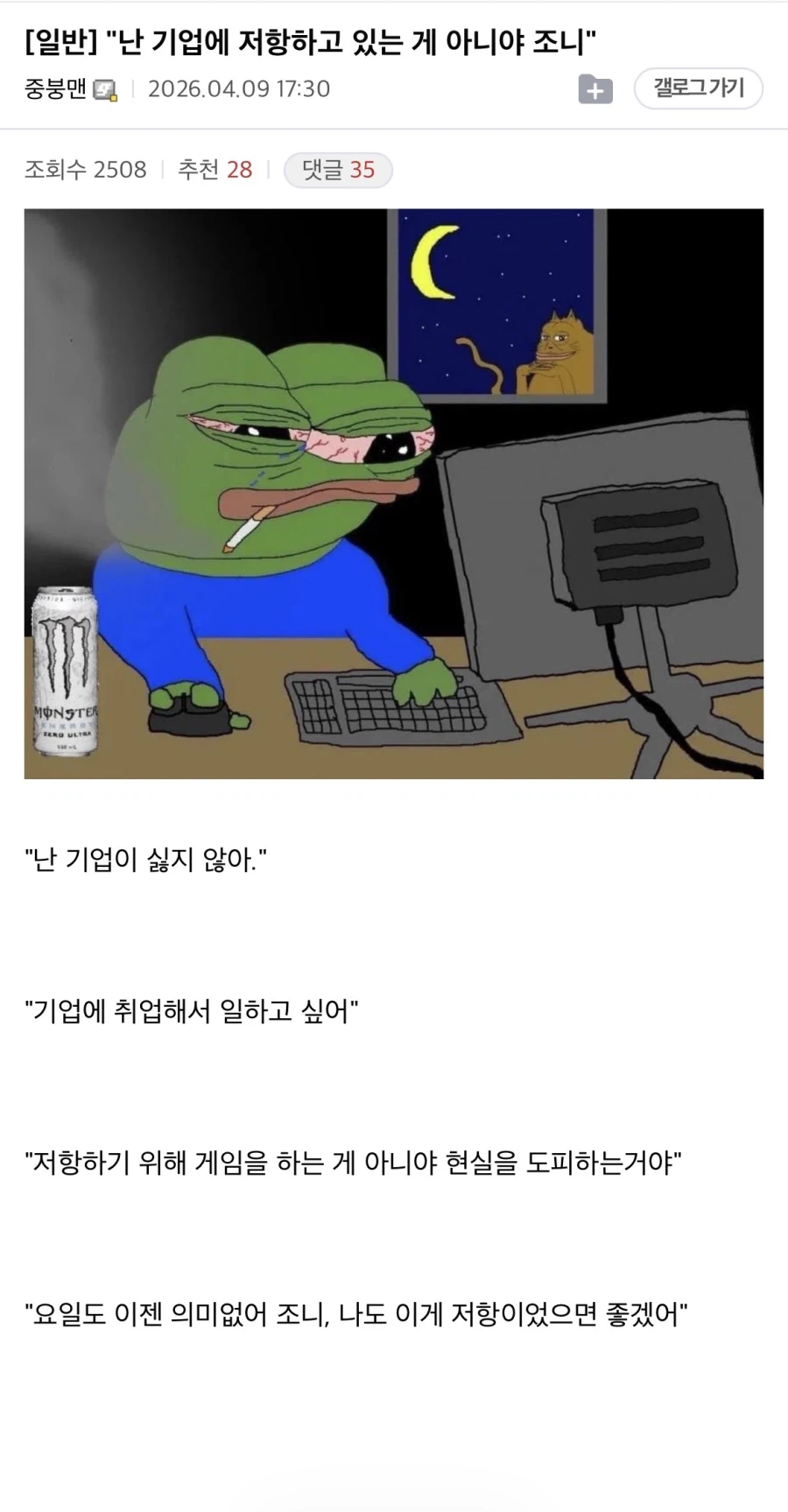 "난 기업에 저항하고 있는 게 아니야 조니" Anonymous | 2026.04.10 10:26 | 조회 11 https://qquing.net/bbs/board.php?bo_table=humor&wr_id=1888000 주소 복사 이전글 다음글 랜덤 만화 목록 본문 추천 0 비추천 0
