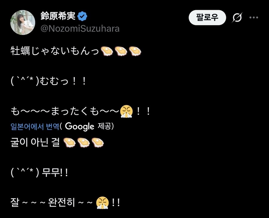 "아 진짜, 내 옷 보고 굴(어패류) 같다고 하지마! " Anonymous | 2025.10.24 13:43 | 조회 10 https://qquing.net/bbs/board.php?bo_table=humor&wr_id=1676764 주소 복사 이전글 다음글 랜덤 만화 목록 본문 한 일본 성우 분이 새로 찍은 프로필 사진. 초장이나 레몬을 대령하라! 추천 0 비추천 0