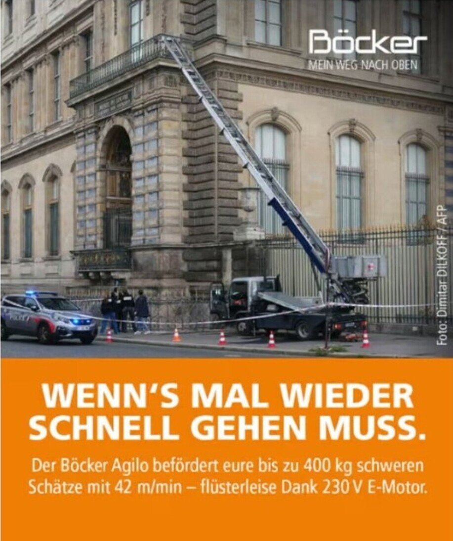 루브르 박물관 도난사건을 기회 삼아 홍보하는 회사 Anonymous | 2025.10.26 08:24 | 조회 6 https://qquing.net/bbs/board.php?bo_table=humor&wr_id=1678944 주소 복사 이전글 다음글 랜덤 만화 목록 본문 루브르 박물관에 강도들이 사다리차 타고 침입해서 훔쳐갔다는 건 이제 다들 알텐데이때 사용된 사다리차를 만든 독일 회사에서"우리 사다리차가 이렇게 조용하고 빠르게 직업가능합니다!" 홍보중임 추천 0 비추천 0