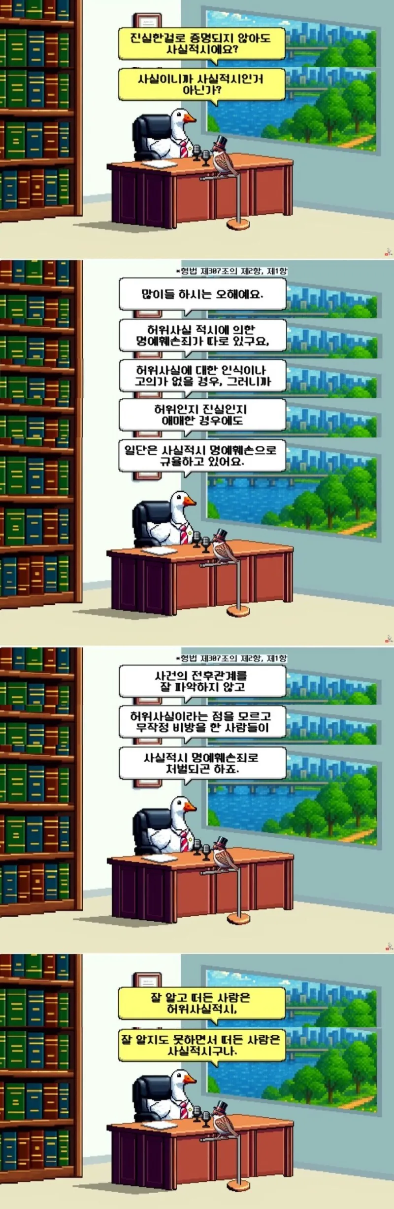 '사실적시 명예훼손'이라는 단어의 진실 Anonymous | 2025.11.05 17:02 | 조회 6 https://qquing.net/bbs/board.php?bo_table=humor&wr_id=1692670 주소 복사 이전글 다음글 랜덤 만화 목록 본문 (상대가 고자가 아님을 아는 상태에서) "저 놈은 고자다"= 허위사실 명예훼손(상대가 고자인지 아닌지 모르는 상태에서) "저 놈은 고자다"= (실제 고자여부와는 관계 없이) 사실적시 명예훼손 추천 0 비추천 0