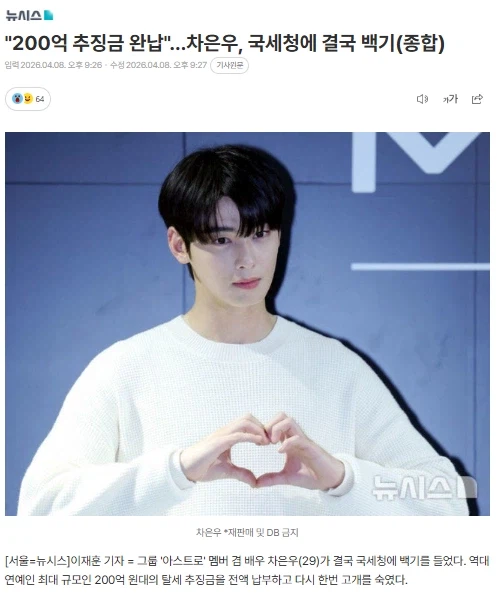"200억 추징금 완납"…차은우, 국세청에 결국 백기 Anonymous | 2026.04.09 15:58 | 조회 12 https://qquing.net/bbs/board.php?bo_table=humor&wr_id=1887089 주소 복사 이전글 다음글 랜덤 만화 목록 본문 "200억 추징금 완납"…차은우, 국세청에 결국 백기(종합) 와우 추천 0 비추천 0