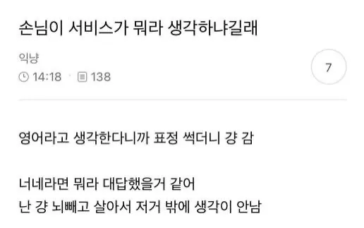"저기요, 서비스가 뭐라 생각하는거에욧?" Anonymous | 2025.09.26 21:22 | 조회 12 https://qquing.net/bbs/board.php?bo_table=humor&wr_id=1643564 주소 복사 이전글 다음글 랜덤 만화 목록 본문 잉그리쒸 추천 0 비추천 0