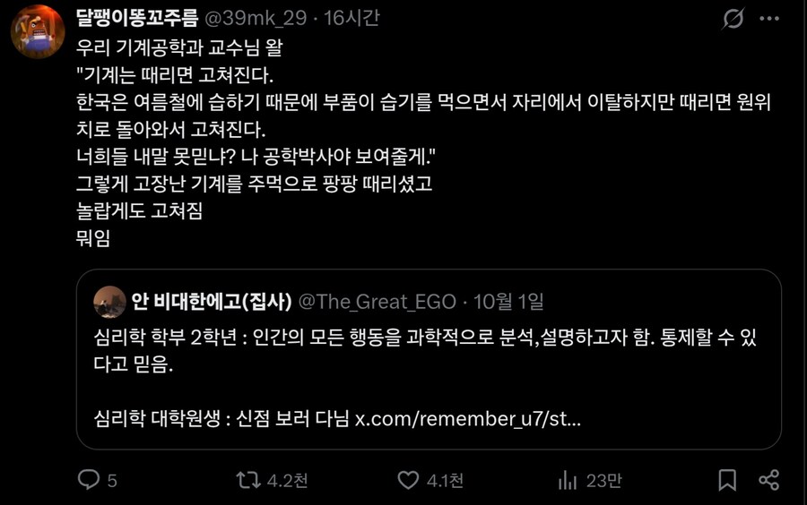 '기계는 때리면 고쳐진다' Anonymous | 2025.10.03 16:54 | 조회 5 https://qquing.net/bbs/board.php?bo_table=humor&wr_id=1651376 주소 복사 이전글 다음글 랜덤 만화 목록 본문 뭔가 설득력이 있어 추천 0 비추천 0