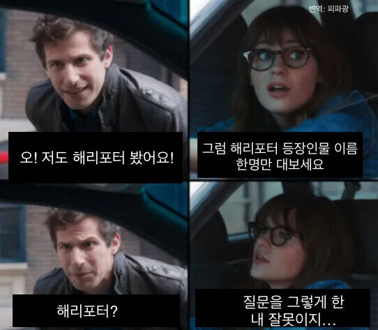 "오! 저도 해리포터 봤어요." Anonymous | 2025.10.04 14:12 | 조회 12 https://qquing.net/bbs/board.php?bo_table=humor&wr_id=1652445 주소 복사 이전글 다음글 랜덤 만화 목록 본문 추천 0 비추천 0