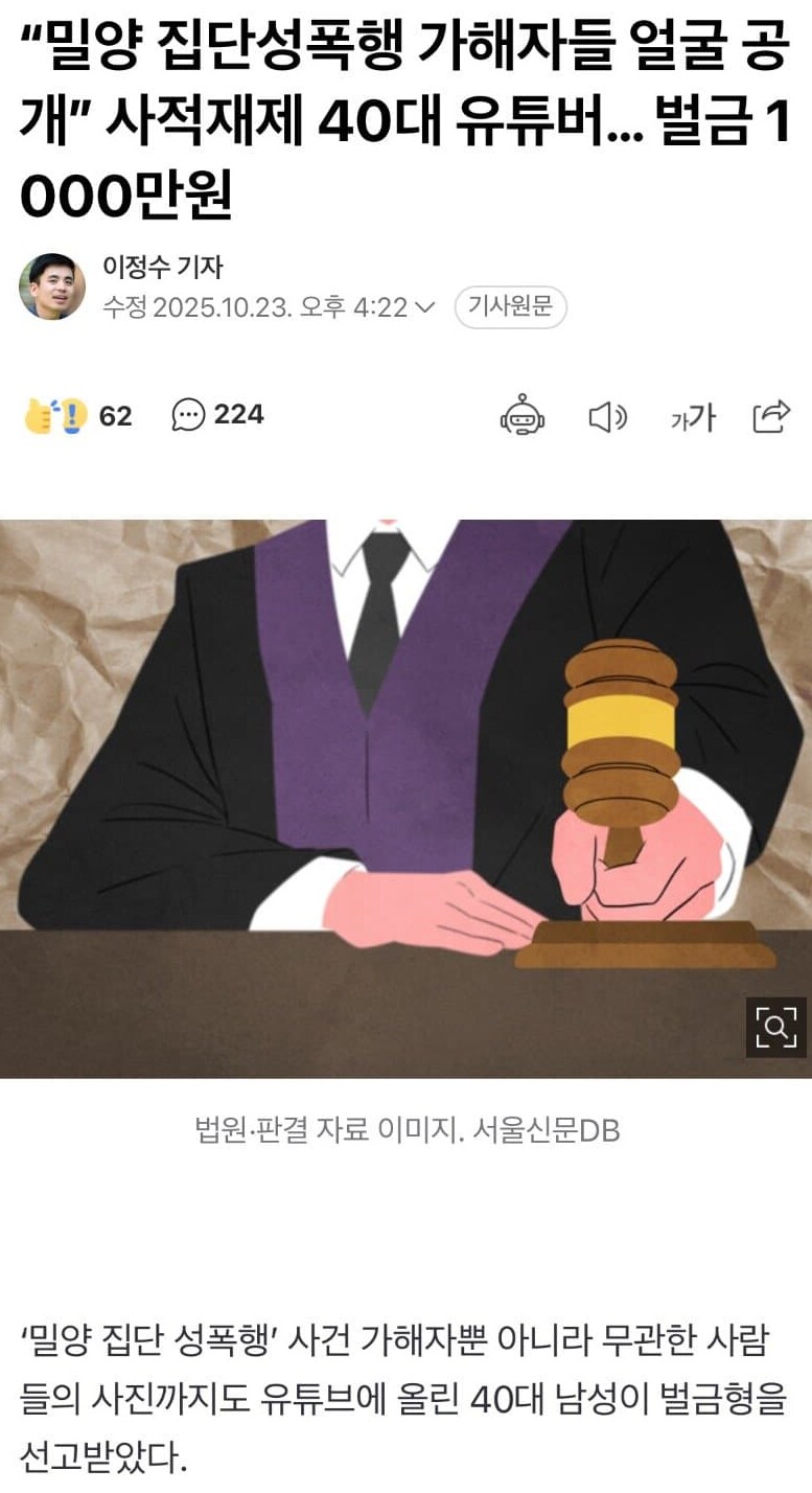 "밀양 집단성폭행 가해자들 얼굴 공개" 40대 유튜버... 벌금 1000만원 Anonymous | 2025.10.24 13:41 | 조회 13 https://qquing.net/bbs/board.php?bo_table=humor&wr_id=1676762 주소 복사 이전글 다음글 랜덤 만화 목록 본문 정29현 추천 0 비추천 0