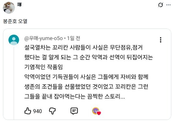 "설국열차는 악역과 선역이 뒤집어지는 기염적인 작품".jpg Anonymous | 2025.12.02 03:24 | 조회 4 https://qquing.net/bbs/board.php?bo_table=humor&wr_id=1724648 주소 복사 이전글 다음글 랜덤 만화 목록 본문 봉준호(사회학과 출신) : 하... 추천 0 비추천 0