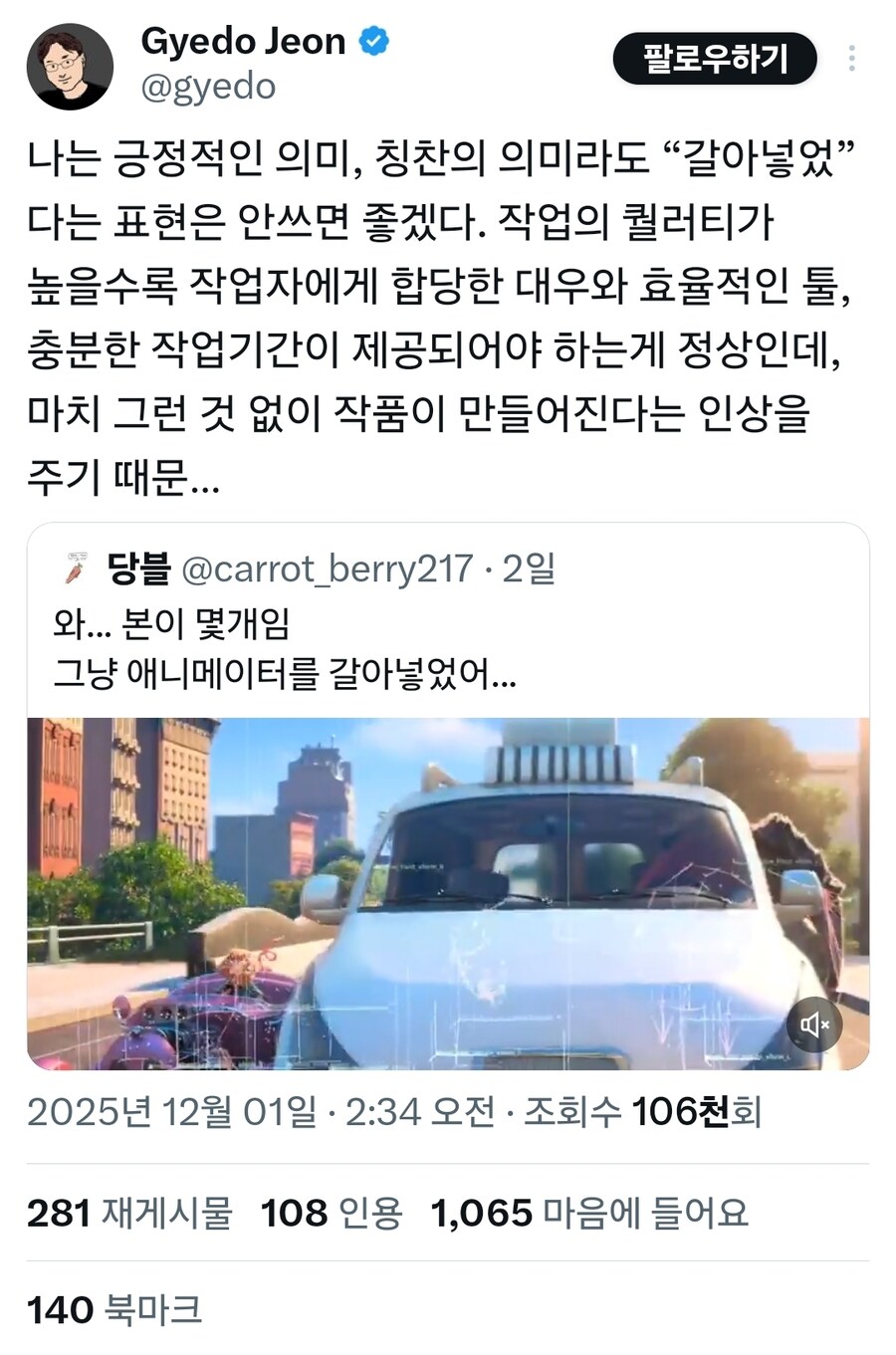 "갈아넣었다"라는 표현을 안 쓰길 바라는 창작자 Anonymous | 2025.12.02 20:58 | 조회 10 https://qquing.net/bbs/board.php?bo_table=humor&wr_id=1725479 주소 복사 이전글 다음글 랜덤 만화 목록 본문 실제로 디즈니에서 일했다가 주토피아1 나왔을 때 정리해고 당했다고함 추천 0 비추천 0