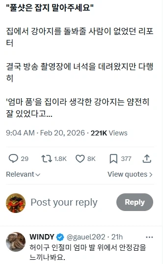 "풀 샷은 잡지 말아주세요" Anonymous | 2026.02.22 17:39 | 조회 7 https://qquing.net/bbs/board.php?bo_table=humor&wr_id=1826216 주소 복사 이전글 다음글 랜덤 만화 목록 본문 추천 0 비추천 0