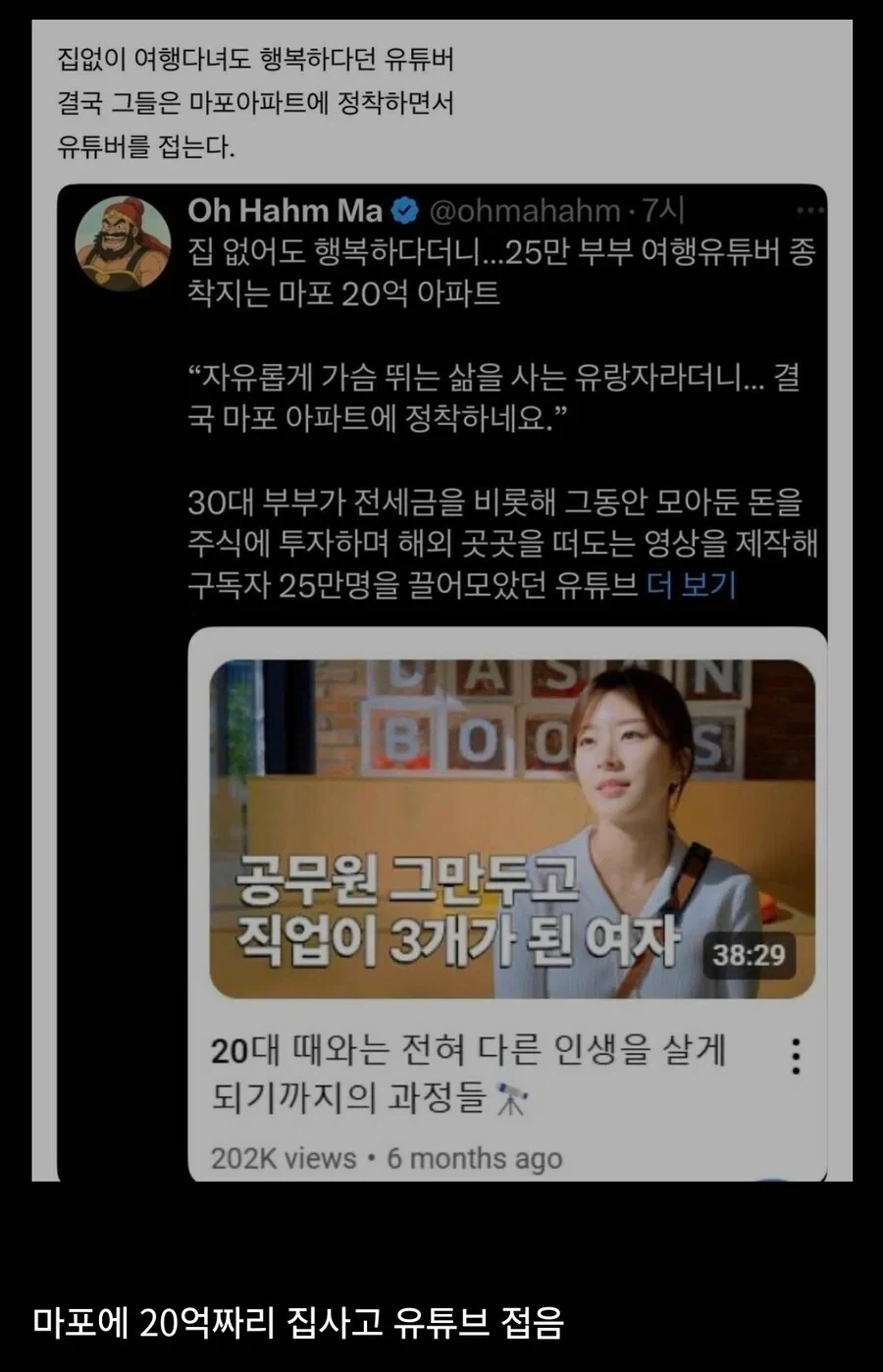 '집없어도 행복하다'는 컨셉의 유튜버 결말 Anonymous | 2026.02.22 20:43 | 조회 14 https://qquing.net/bbs/board.php?bo_table=humor&wr_id=1826383 주소 복사 이전글 다음글 랜덤 만화 목록 본문 ?? 추천 0 비추천 0