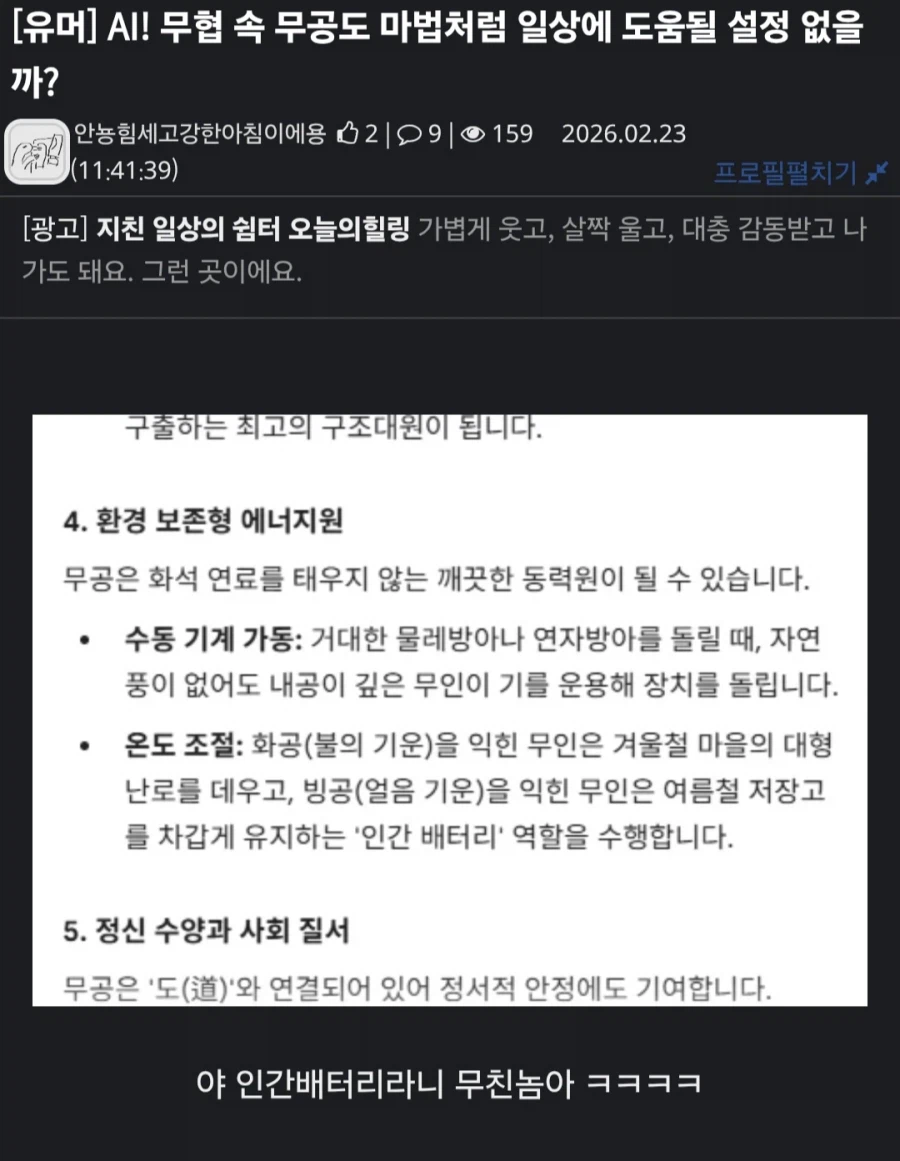 ''21세기에... 무림인이 무얼 할 수 있죠?'' Anonymous | 2026.02.23 20:50 | 조회 12 https://qquing.net/bbs/board.php?bo_table=humor&wr_id=1827551 주소 복사 이전글 다음글 랜덤 만화 목록 본문 ??: 무공으로 터빈을 돌립니다 추천 0 비추천 0