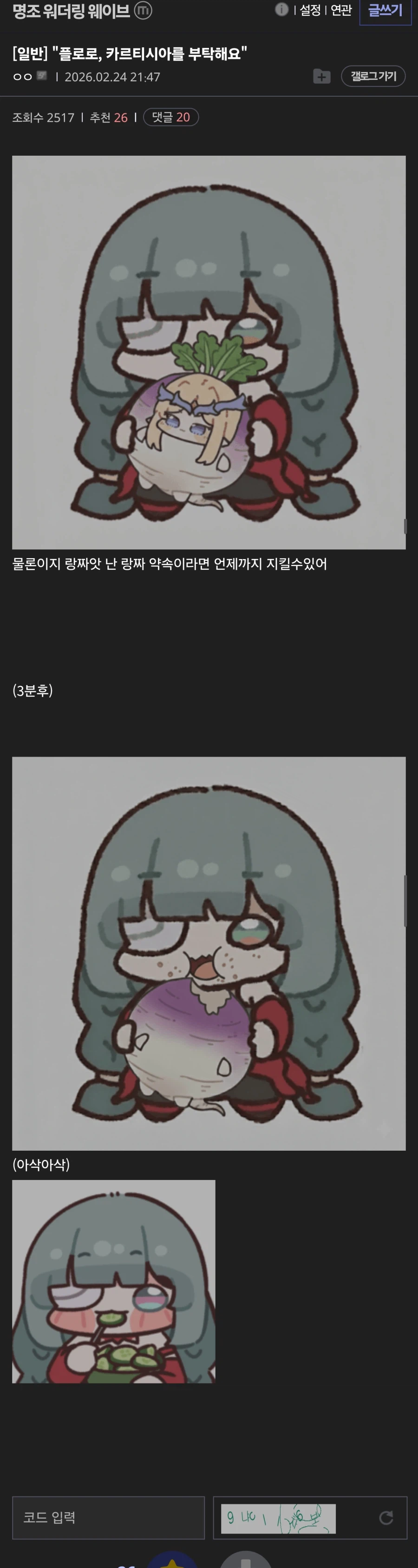 "플로로, 카르티시아를 부탁해요" Anonymous | 2026.02.25 18:06 | 조회 13 https://qquing.net/bbs/board.php?bo_table=humor&wr_id=1829920 주소 복사 이전글 다음글 랜덤 만화 목록 본문 추천 0 비추천 0