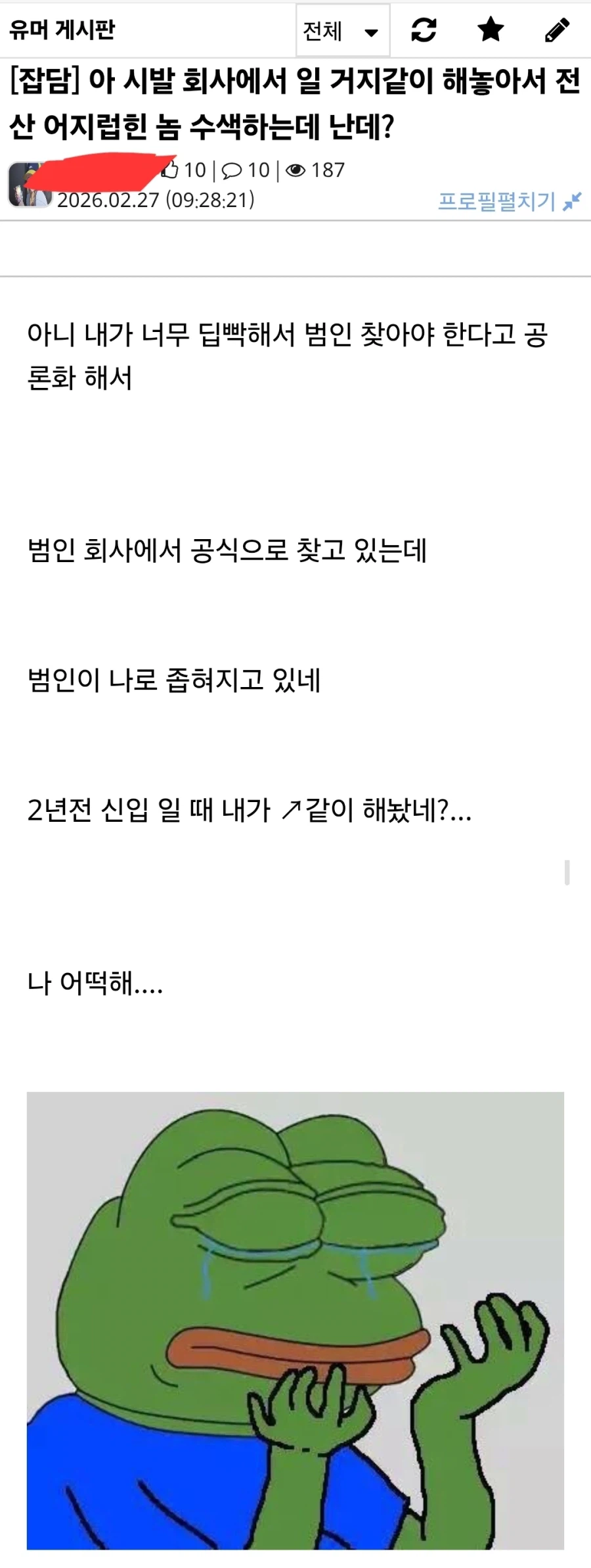 "일처리를 이리도 거지같이 한 자를 당장 색출해야 하오!!" Anonymous | 2026.02.27 16:37 | 조회 13 https://qquing.net/bbs/board.php?bo_table=humor&wr_id=1832529 주소 복사 이전글 다음글 랜덤 만화 목록 본문 어? 추천 0 비추천 0