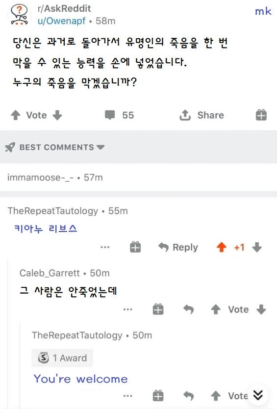 "과거의 유명인의 죽음을 한 번 막을 수 있는 능력!" Anonymous | 2026.02.27 21:32 | 조회 26 https://qquing.net/bbs/board.php?bo_table=humor&wr_id=1832801 주소 복사 이전글 다음글 랜덤 만화 목록 본문 "고맙다는 인사는 넣어두시죠" 추천 0 비추천 0
