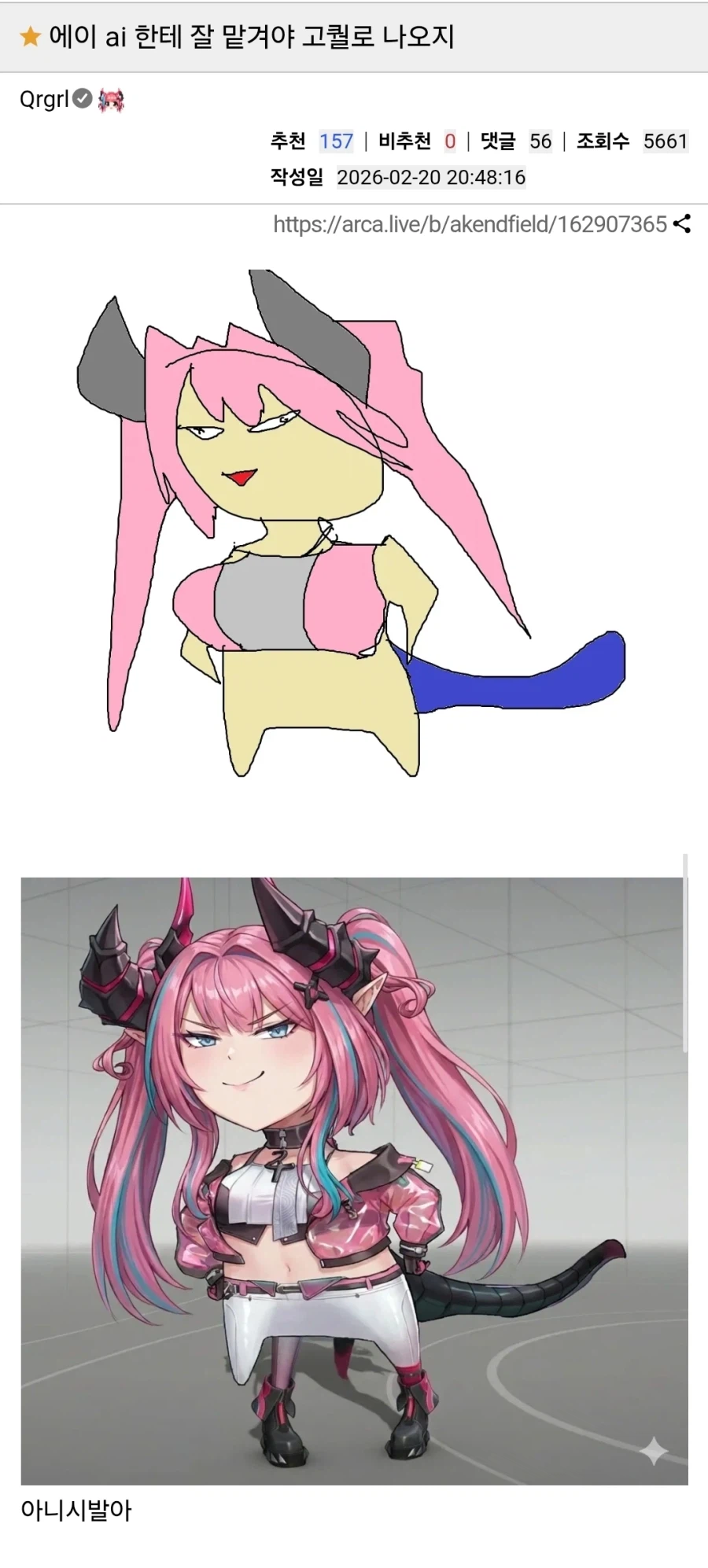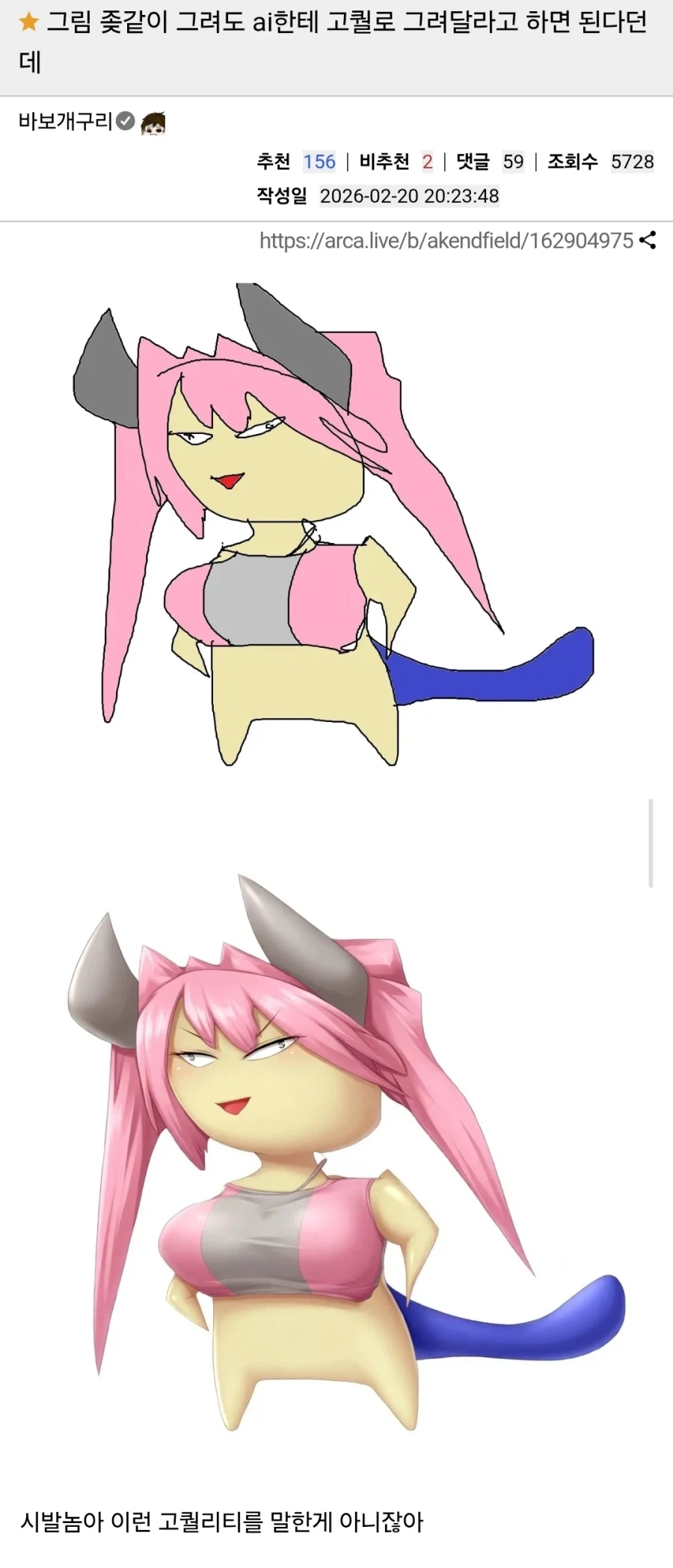 "못그린 그림도 AI한테 그림 고퀄로 그려달라 하면 된다던데" Anonymous | 2026.03.01 20:06 | 조회 28 https://qquing.net/bbs/board.php?bo_table=humor&wr_id=1835222 주소 복사 이전글 다음글 랜덤 만화 목록 본문 실패했다네요 추천 0 비추천 0