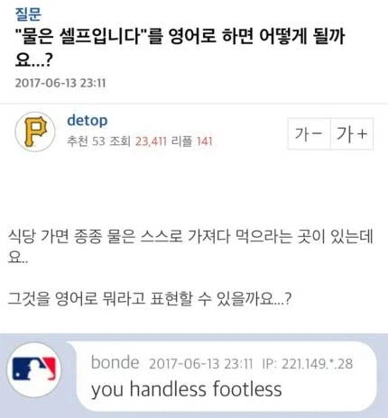 '물은 셀프 입니다.'를 영어로 어떻게 쓰죠…?.jpg Anonymous | 2026.03.02 03:10 | 조회 17 https://qquing.net/bbs/board.php?bo_table=humor&wr_id=1835676 주소 복사 이전글 다음글 랜덤 만화 목록 본문 니는 손이 없냐 발이 없냐 추천 0 비추천 0