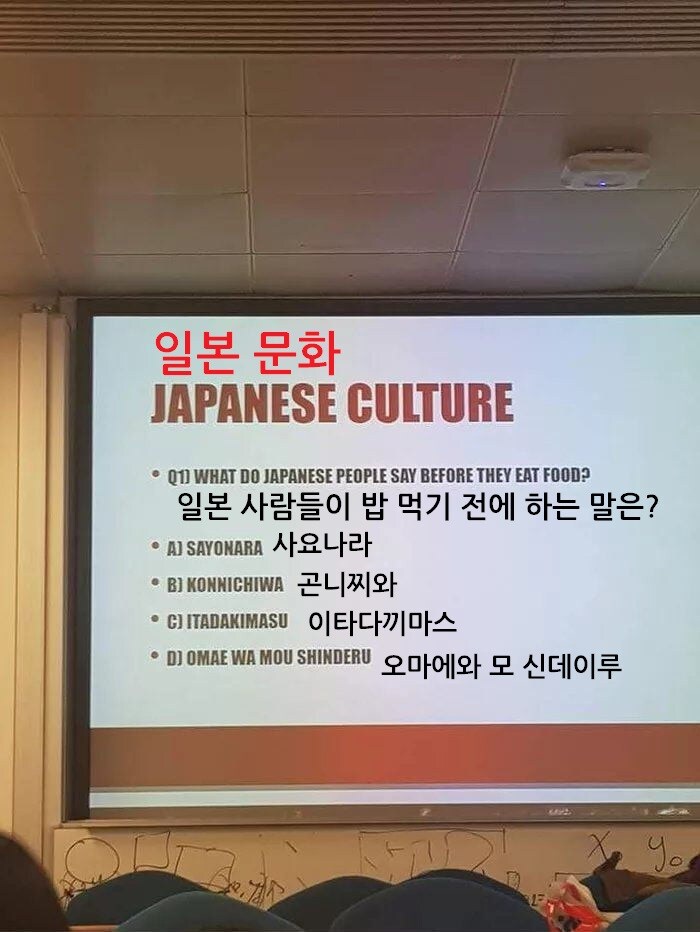 "일본어를 배워봅시다!" Anonymous | 2026.03.02 09:20 | 조회 12 https://qquing.net/bbs/board.php?bo_table=humor&wr_id=1835890 주소 복사 이전글 다음글 랜덤 만화 목록 본문 "자, 따라해보세요. "OMAE WA MOU SHINDEIRU."" "NANI?!?!" 추천 0 비추천 0