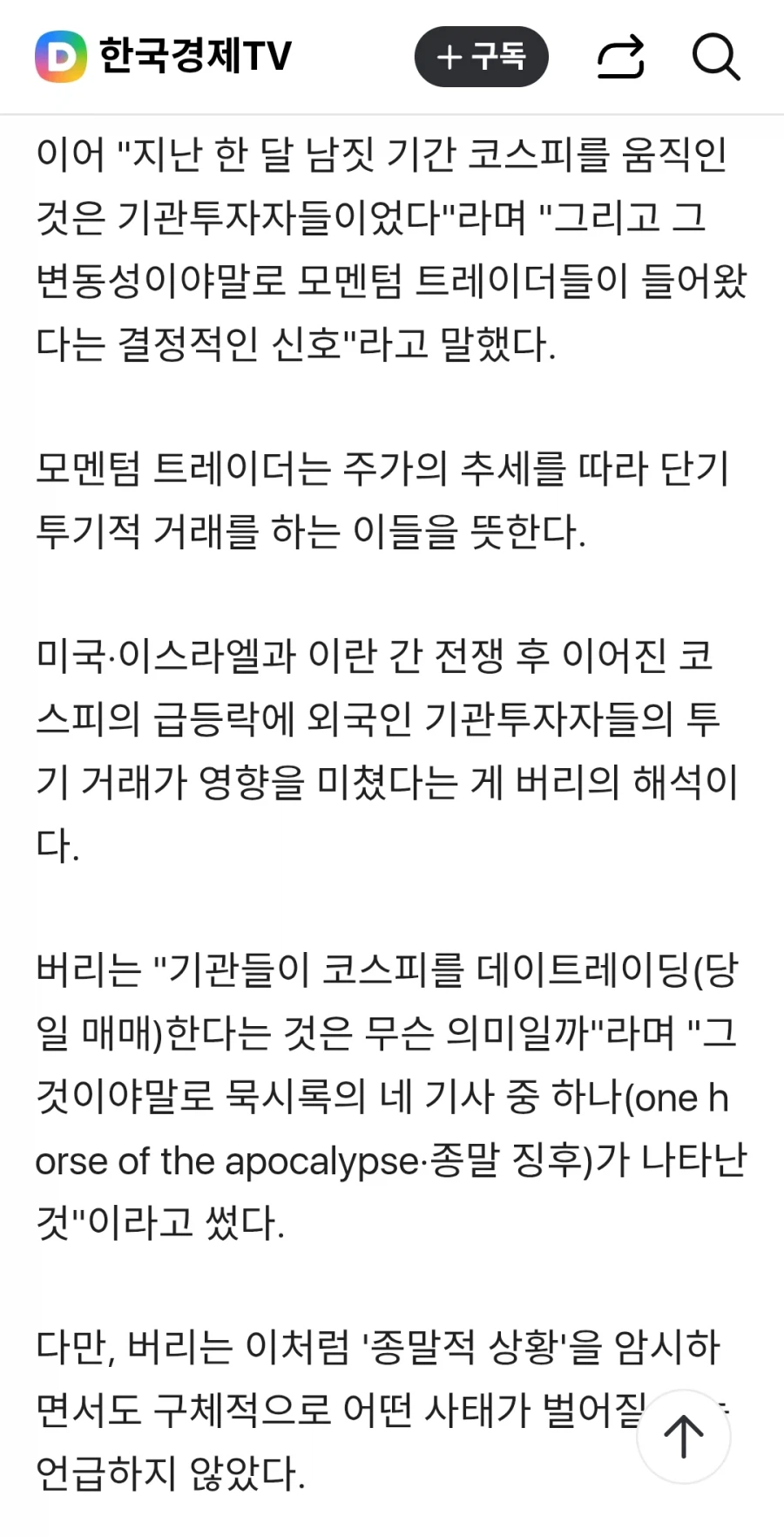 '빅쇼트' 버리, 코스피 급등락 두고 "종말 징후" Anonymous | 2026.03.07 00:28 | 조회 11 https://qquing.net/bbs/board.php?bo_table=humor&wr_id=1842200 주소 복사 이전글 다음글 랜덤 만화 목록 본문 시즌 몇번째 종말론이 되려나 추천 0 비추천 0