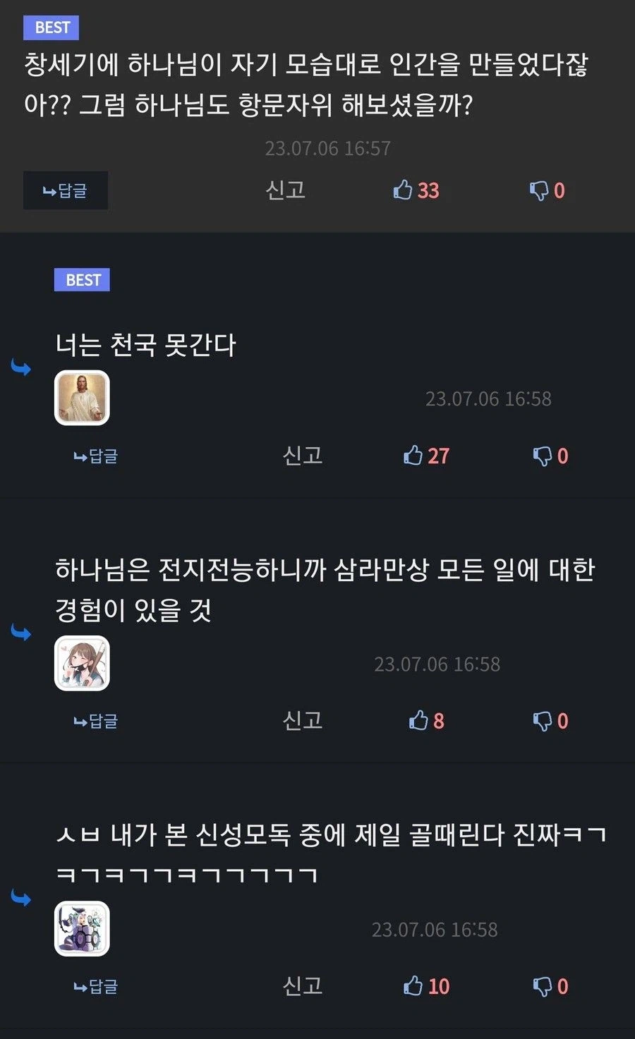 "인간의 행동은 모두 신을 본뜬것" Anonymous | 2026.03.07 01:36 | 조회 12 https://qquing.net/bbs/board.php?bo_table=humor&wr_id=1842275 주소 복사 이전글 다음글 랜덤 만화 목록 본문 추천 0 비추천 0