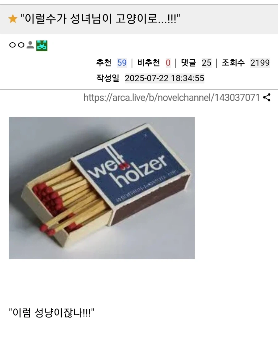 "우왓 성녀님이 고양이로....!" Anonymous | 2026.03.11 09:47 | 조회 14 https://qquing.net/bbs/board.php?bo_table=humor&wr_id=1847412 주소 복사 이전글 다음글 랜덤 만화 목록 본문 성냥이 되었다네요 추천 0 비추천 0