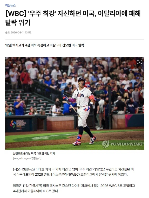 '우주 최강' 자신하던 미국, 이탈리아에 패해 탈락 위기 Anonymous | 2026.03.11 16:54 | 조회 11 https://qquing.net/bbs/board.php?bo_table=humor&wr_id=1847843 주소 복사 이전글 다음글 랜덤 만화 목록 본문 [WBC] "우주 최강" 자신하던 미국, 이탈리아에 패해 탈락 위기 | 연합뉴스 미국의 킹우의 수 양팀 5실점 내로 멕시코 승리시, 미국 탈락 추천 0 비추천 0