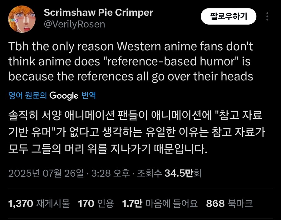 "미애니는 오그라드는 패러디로 웃기려고 하고... 아니메가 짱이야" Anonymous | 2026.03.12 10:32 | 조회 20 https://qquing.net/bbs/board.php?bo_table=humor&wr_id=1848821 주소 복사 이전글 다음글 랜덤 만화 목록 본문 느그들이 죄다 못알아들어서 그러는거지 ㅋㅋ일본애니갘ㅋㅋ 패러디를안핰ㅋㅋㅋㅋ (팬스가는 구린 대중문화 패러디를 안하니 미국애니보다 우월하다는 일뽕씹덕들 얘기가 트이타에서 핫했을때) 추천 0 비추천 0