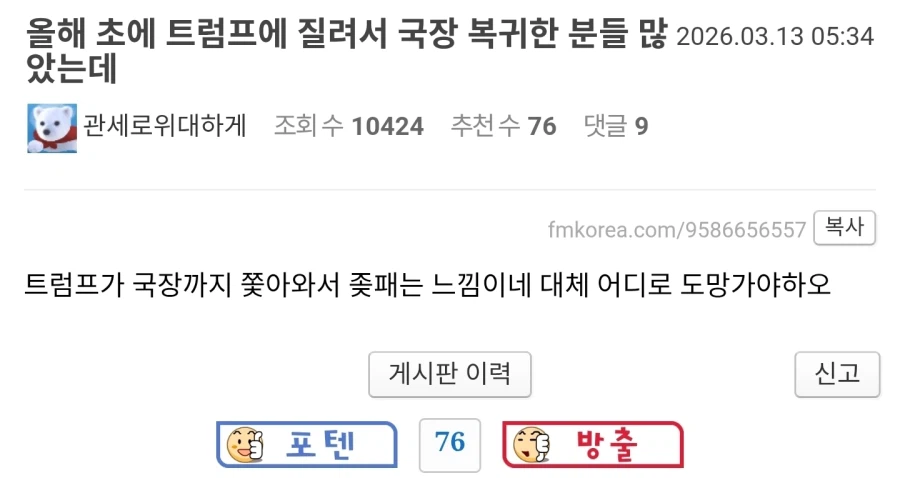 "트럼프 때문에 ↗같아서 국장 복귀함 ㅅㄱ" Anonymous | 2026.03.13 11:37 | 조회 14 https://qquing.net/bbs/board.php?bo_table=humor&wr_id=1850242 주소 복사 이전글 다음글 랜덤 만화 목록 본문 추천 0 비추천 0