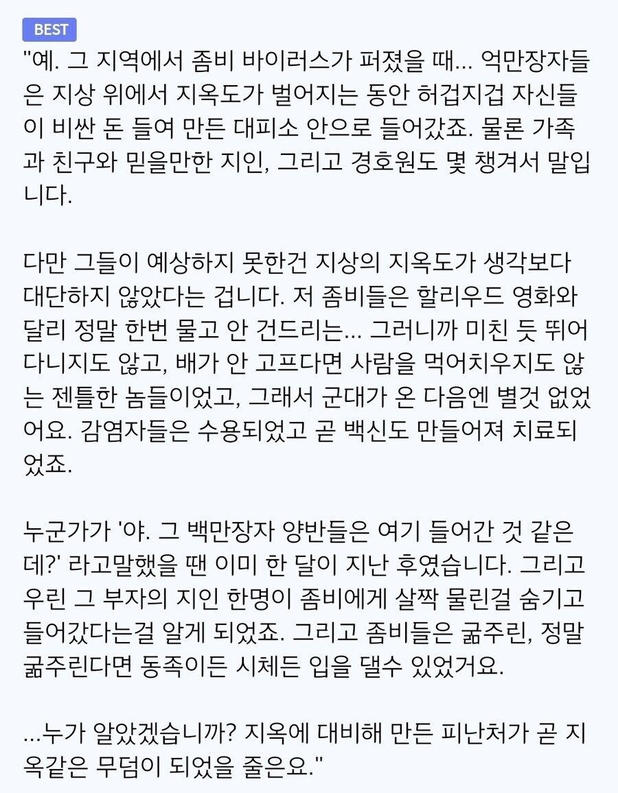 "좀비 사태가 벌어져도 억만장자들은 안전함ㅋㅋ" Anonymous | 2026.03.14 03:08 | 조회 12 https://qquing.net/bbs/board.php?bo_table=humor&wr_id=1851204 주소 복사 이전글 다음글 랜덤 만화 목록 본문 그리고 벙커 안 최후의 생존자가 겨우 지상으로 탈출하다가입구의 십자가에 발이 걸려 넘어지고, 결국 그 사이 쫓아온 좀비들에게 잡혀 비명을 지르며 벙커의 어둠 속으로 사라지는 엔딩. 추천 0 비추천 0