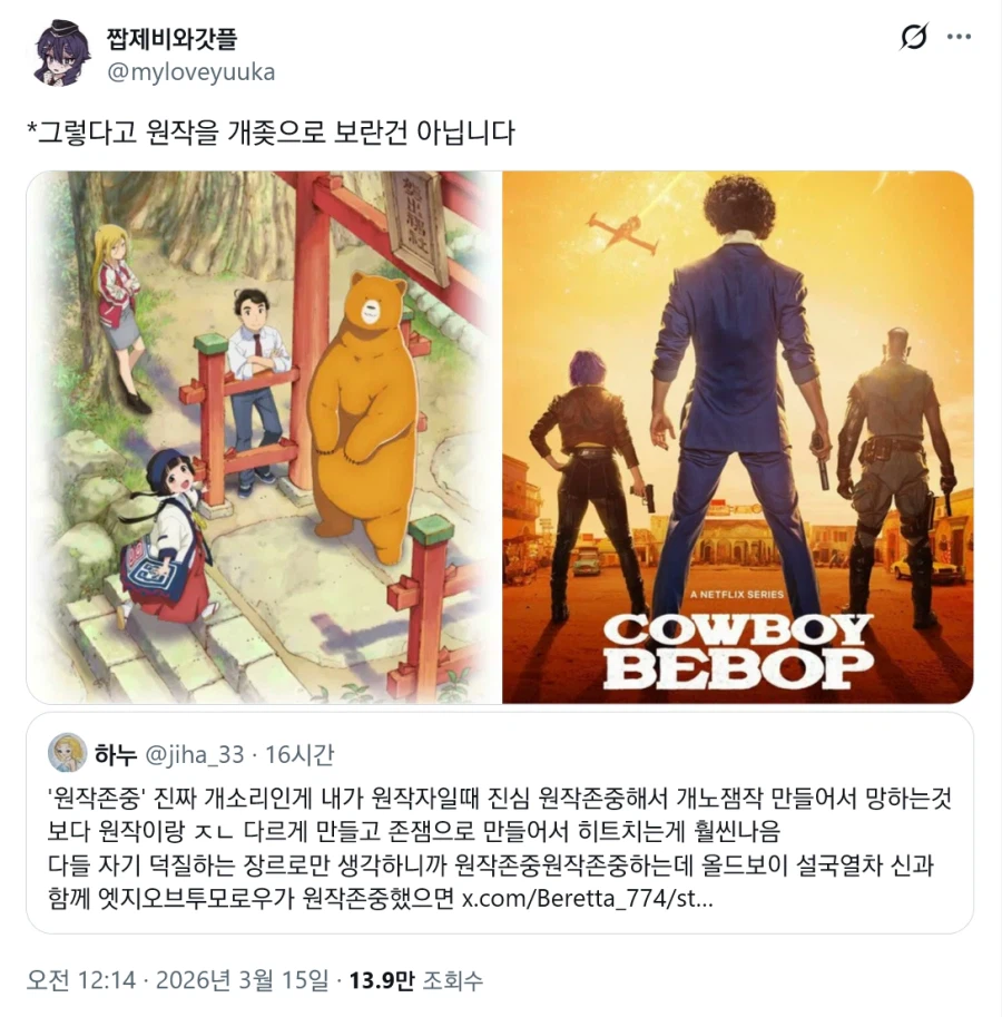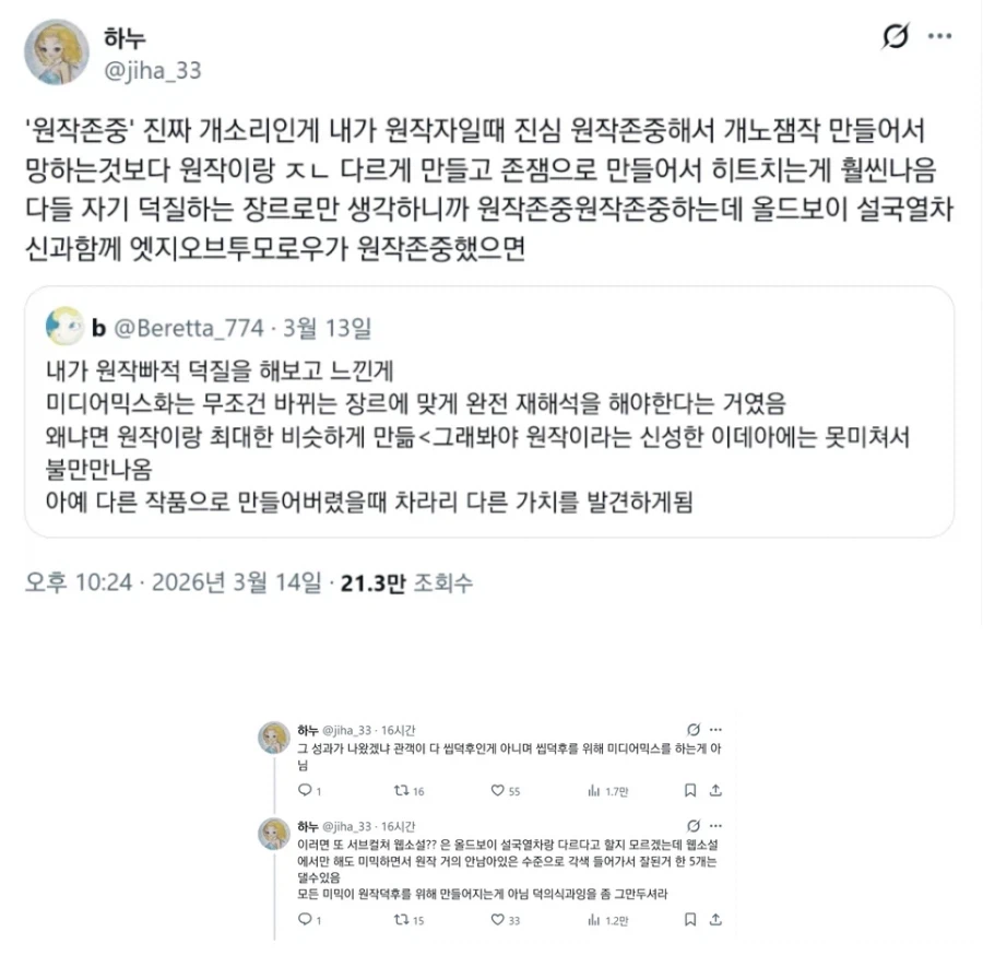 "??? : 원작존중 하라는게 개소리인 이유" .jpg Anonymous | 2026.03.15 19:24 | 조회 6 https://qquing.net/bbs/board.php?bo_table=humor&wr_id=1853366 주소 복사 이전글 다음글 랜덤 만화 목록 본문 추천 0 비추천 0