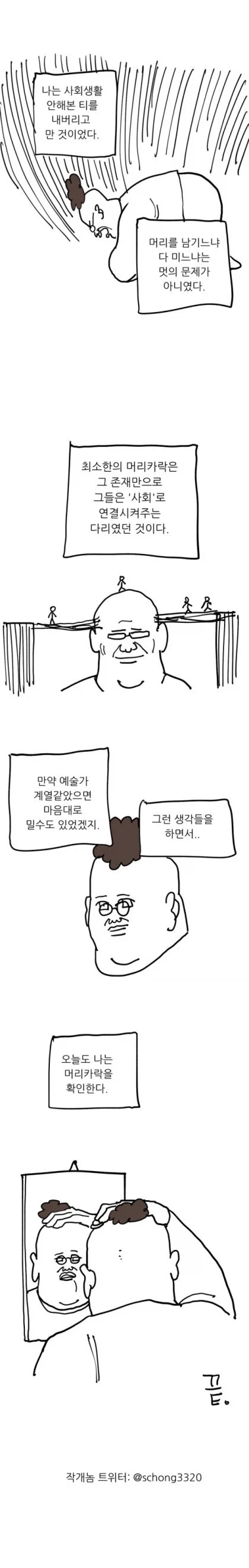 "탈모면 그냥 시원하게 밀어버리죠?" Anonymous | 2026.03.16 17:26 | 조회 19 https://qquing.net/bbs/board.php?bo_table=humor&wr_id=1854622 주소 복사 이전글 다음글 랜덤 만화 목록 본문 실제로 자의로 만들어낸 민머리 사회인과자의가 아닌 사회인 탈모는 인상차이가 크다 함 추천 0 비추천 0