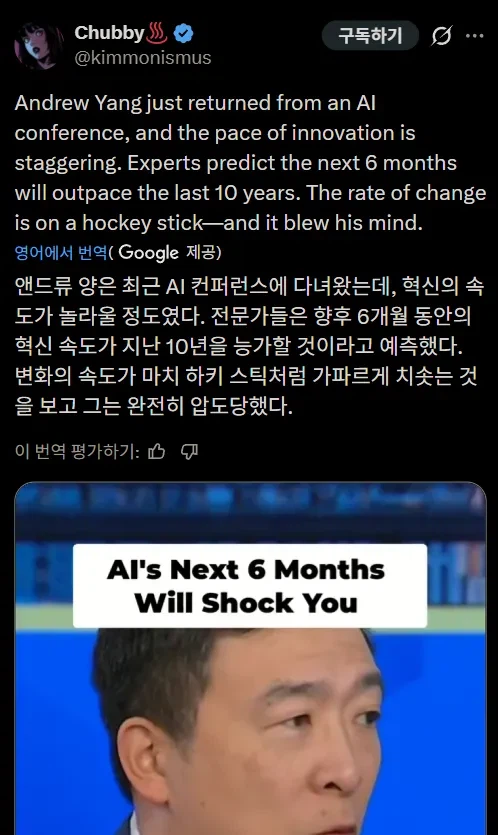 '앞으로 AI 발전속도가 하키스틱 같을것' Anonymous | 2026.03.16 18:34 | 조회 17 https://qquing.net/bbs/board.php?bo_table=humor&wr_id=1854711 주소 복사 이전글 다음글 랜덤 만화 목록 본문 앞으로 6개월간 AI 발전속도가 이럴거라 함 추천 0 비추천 0