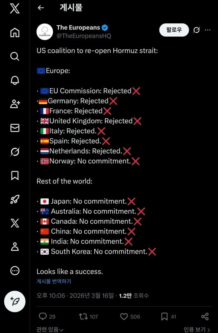세계 대통합을 이루어낸 트럼프 Anonymous | 2026.03.17 10:00 | 조회 11 https://qquing.net/bbs/board.php?bo_table=humor&wr_id=1855624 주소 복사 이전글 다음글 랜덤 만화 목록 본문 트럼프의 호르무즈 소집령 결과 모두 거부함 세계 대통합은 트럼프 추천 0 비추천 0