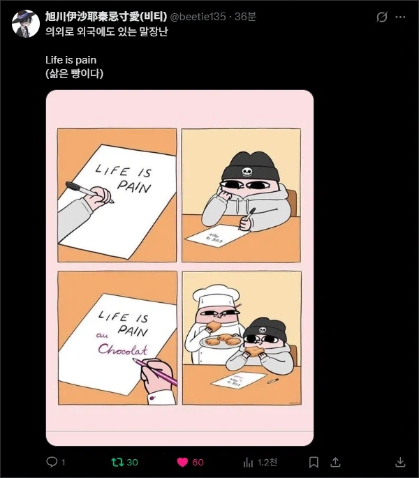 "삶은 달걀이다" 의 외국 버전 : Anonymous | 2026.03.18 08:04 | 조회 10 https://qquing.net/bbs/board.php?bo_table=humor&wr_id=1857063 주소 복사 이전글 다음글 랜덤 만화 목록 본문 "삶은 빵(Pain)이다" ...어떻게 "Pain"이 "빵"이 되는 거지??? 추천 0 비추천 0