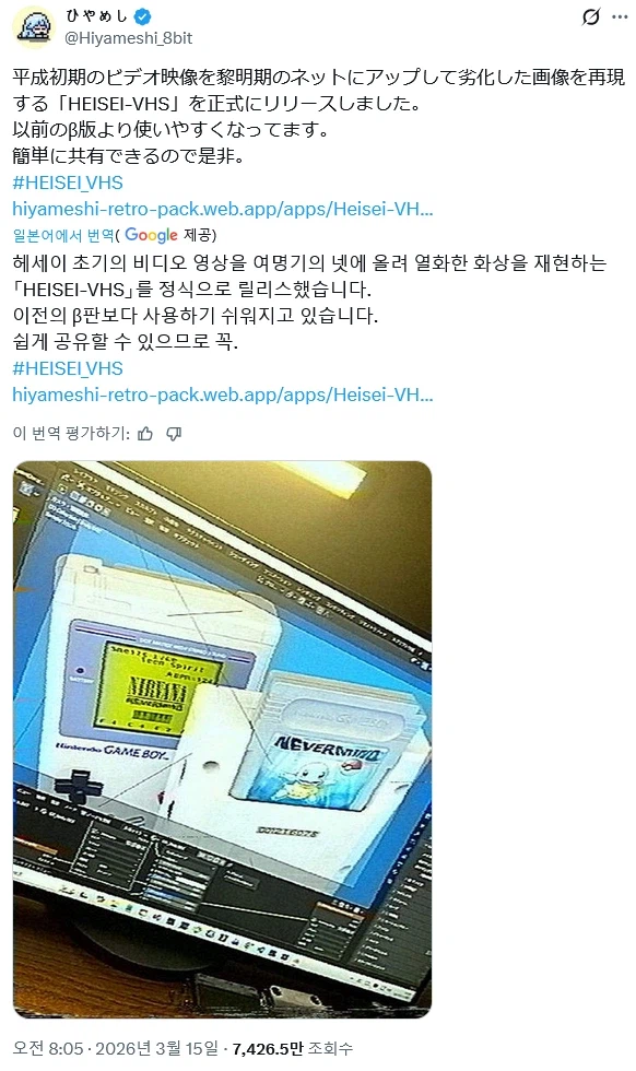 "90년대 비디오 화질처럼 바꿔주는 필터" Anonymous | 2026.03.18 18:26 | 조회 13 https://qquing.net/bbs/board.php?bo_table=humor&wr_id=1857630 주소 복사 이전글 다음글 랜덤 만화 목록 본문 존재하지 않는 30년 전의 추억들 추천 0 비추천 0